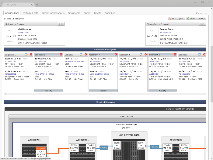 Predefine existing infrastructure connections (like room-to-room) and use those connections, and new ones, to build the path of a cross connect.