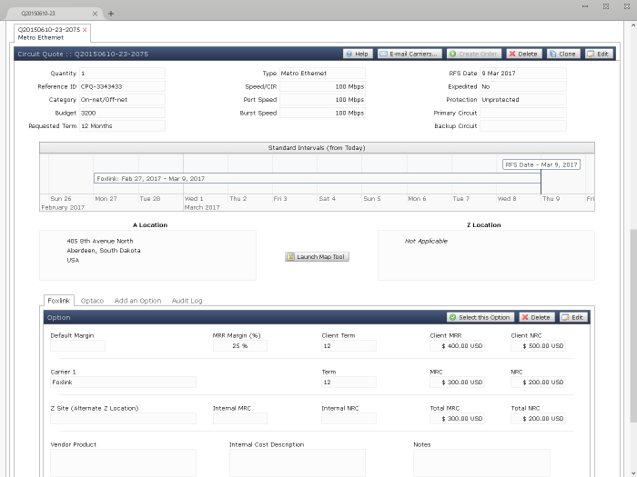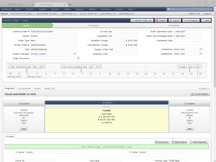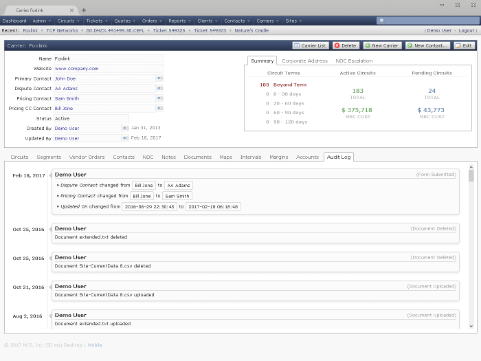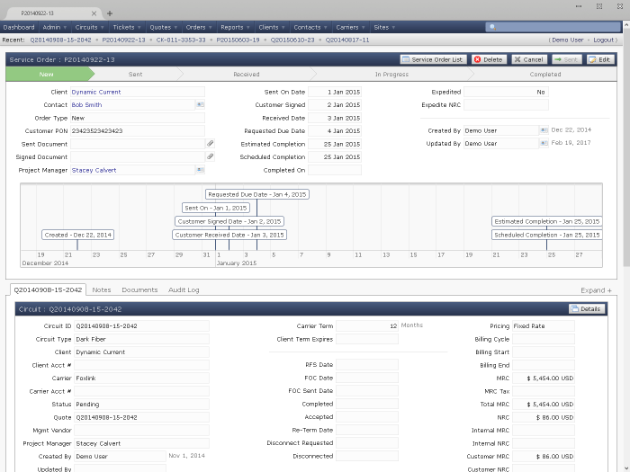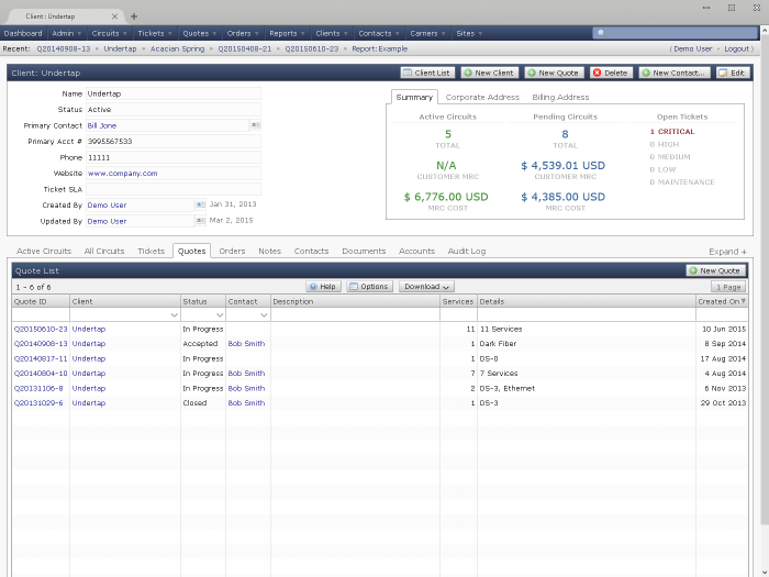 Maintain a record of very circuit, quote, and order in your customer's history.