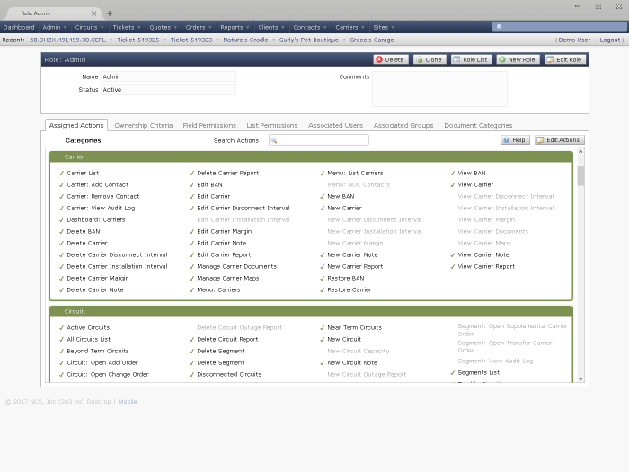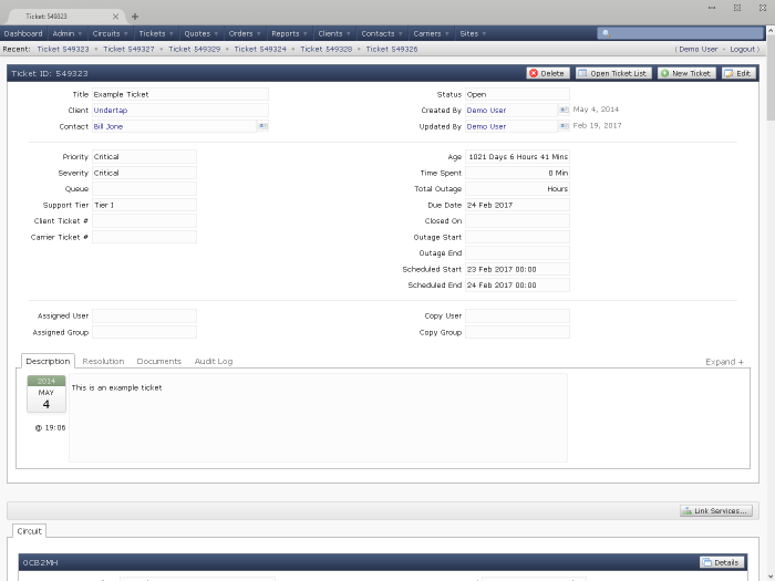 Use the trouble ticket feature to track customer issues related to circuits and document outages.