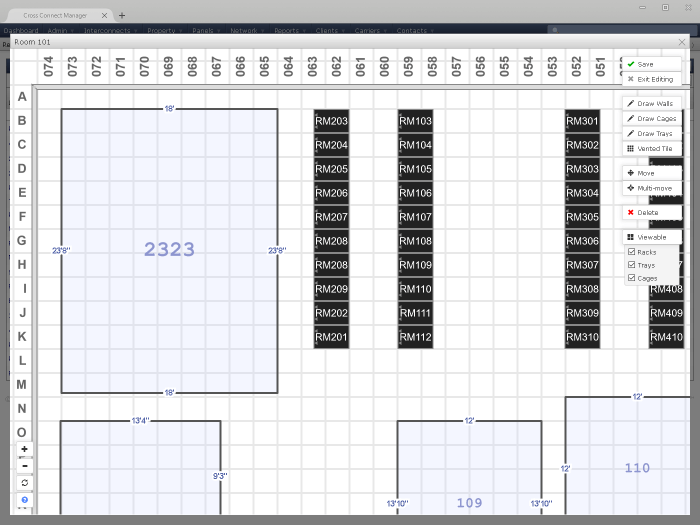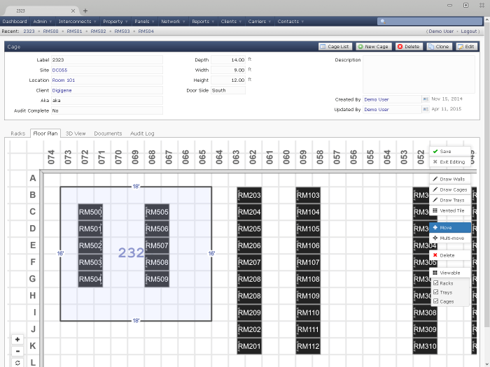 Use the floorplan editor to position cages and racks in a flexible room layout. All browser based, not special plugins required.