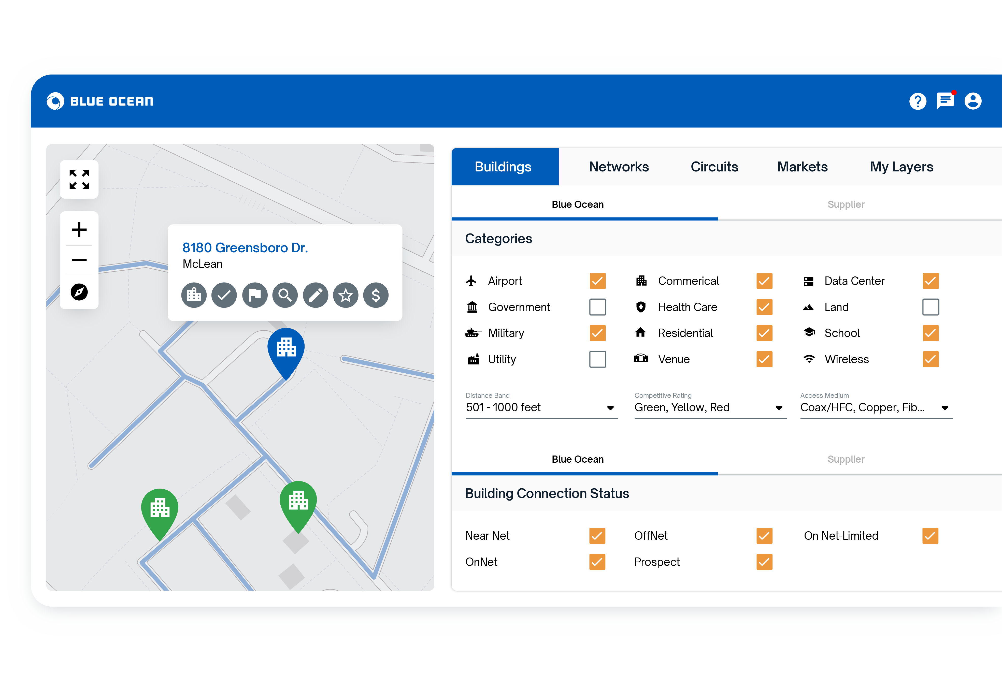 With this data, you can use filters to sort through the noise and identify the right sales prospects to pursue at a building level. You can easily qualify your best RFPs by immediately identifying the intersection percentage between RFP locations and your network footprint.