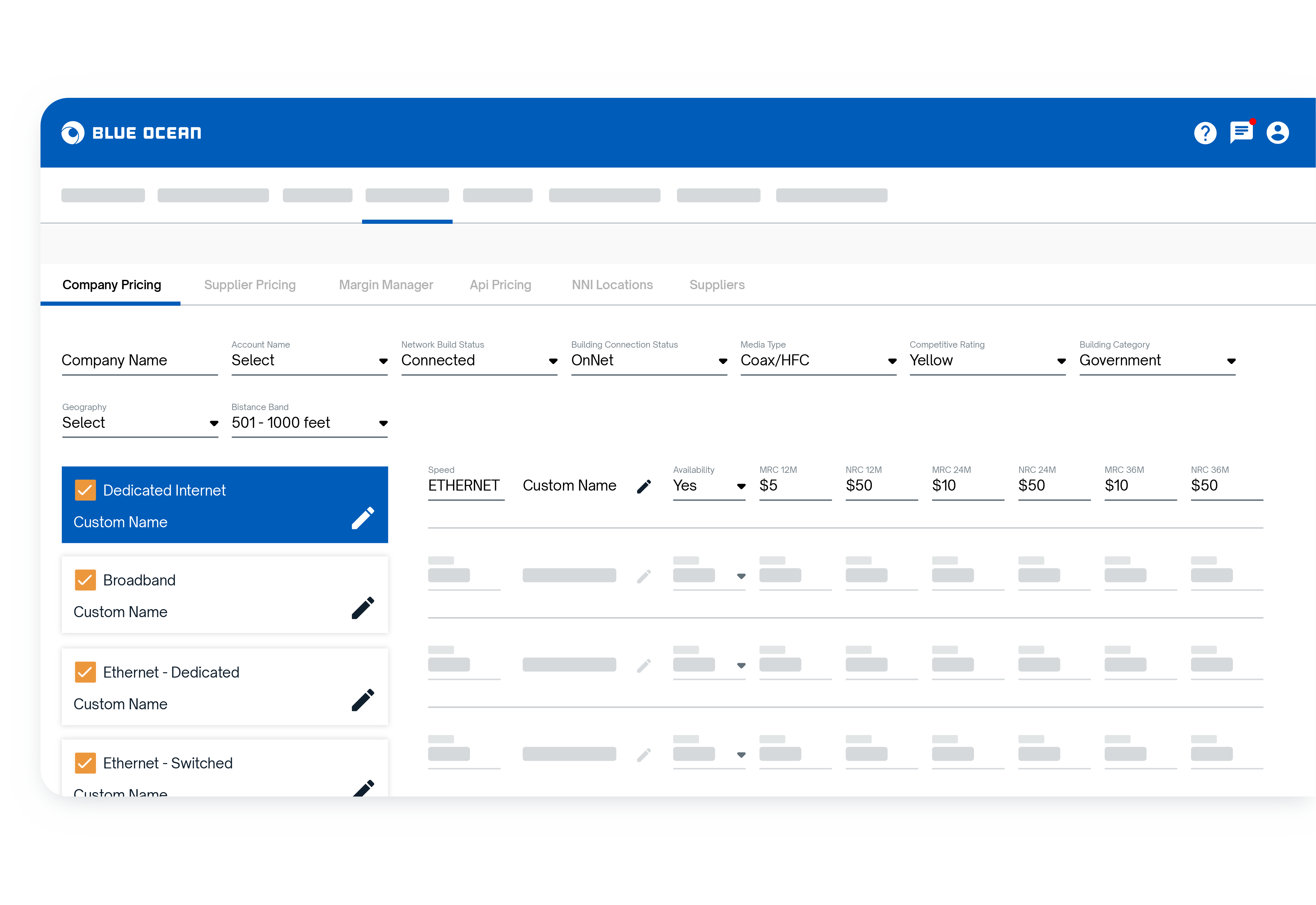 Your pricing should be unique at each of your serviceable locations based on the product being offered, the dynamics of the location itself, and the terms of the offering. Our platform natively offers a connectivity-oriented product catalog (spanning broadband, ethernet, dark fiber, etc) with the ability to simply configure pricing for a variety of terms across various location dynamics.