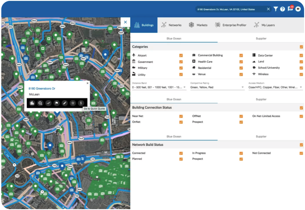 Connectbase’s Network Finder Module allows our users to search for the LEC Local Exchange Carrier (LEC), cable company, CLEC, On-Net, and Near-Net fiber providers, such as yours, by location and get a profile of each company within seconds – with thousands of global network operators currently profiled.